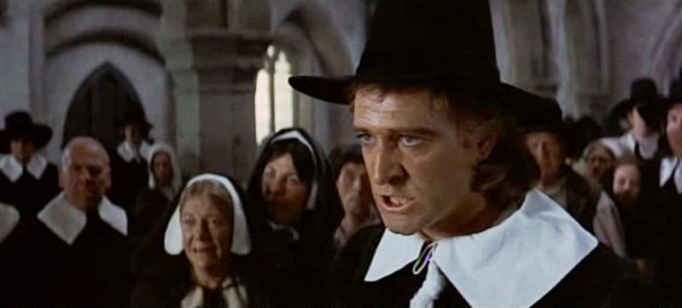 A los diez minutos de película, observamos una secuencia que muestra a la perfección el rechazo de los puritanos a la intromisión del catolicismo en Inglaterra: durante la celebración de la liturgia en la iglesia, Cromwell observa que sobre el altar se hallan colocados un crucifijo y seis velas, es decir, ornamentos propios de la liturgia católica. Se levanta, interrumpe la celebración, señala hacia el altar y pregunta al presbítero: “¿Quién ha hecho eso?”, a lo que este responde: “Obedece a un edicto usado por el propio arzobispo, y por orden del rey”. Cromwell estalla en cólera, arroja al suelo todos los objetos sagrados y pregunta enérgico: “¿Es que la Iglesia Católica Romana se ha asentado en Westminster?”. He aquí otra de las causas de la revolución: la cuestión religiosa. Quizá no fuese el motivo principal, pero la introducción de elementos católicos en la liturgia, cierta desvirtuación de la fe protestante y determinadas decisiones a la hora de nombrar y destituir obispos motivaron al puritanismo a empuñar las armas contra la Monarquía[4].